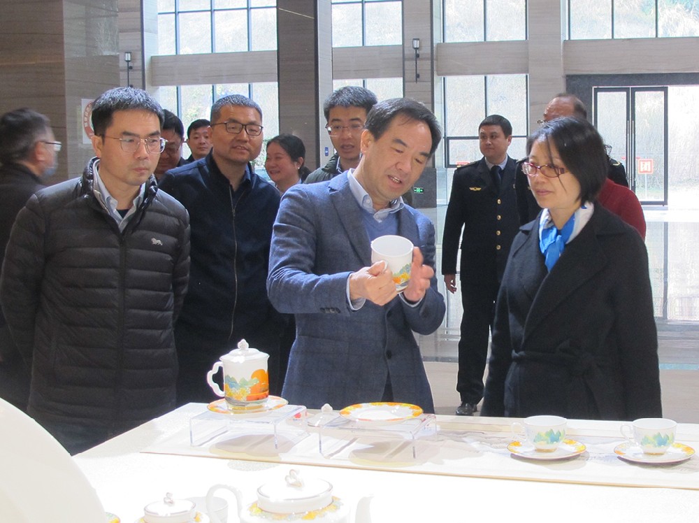 在國(guó)瓷館參觀考察期間,周敏建向調(diào)研組一行簡(jiǎn)要介紹了集團(tuán)公司發(fā)展歷程。大家邊走邊看,不時(shí)駐足拿起產(chǎn)品仔細(xì)品鑒或拍照。周敏建在介紹“國(guó)瓷紅葉”產(chǎn)品特色時(shí)詳細(xì)講解了陶瓷生產(chǎn)工藝,講述了一套套有關(guān)“國(guó)瓷”的故事。